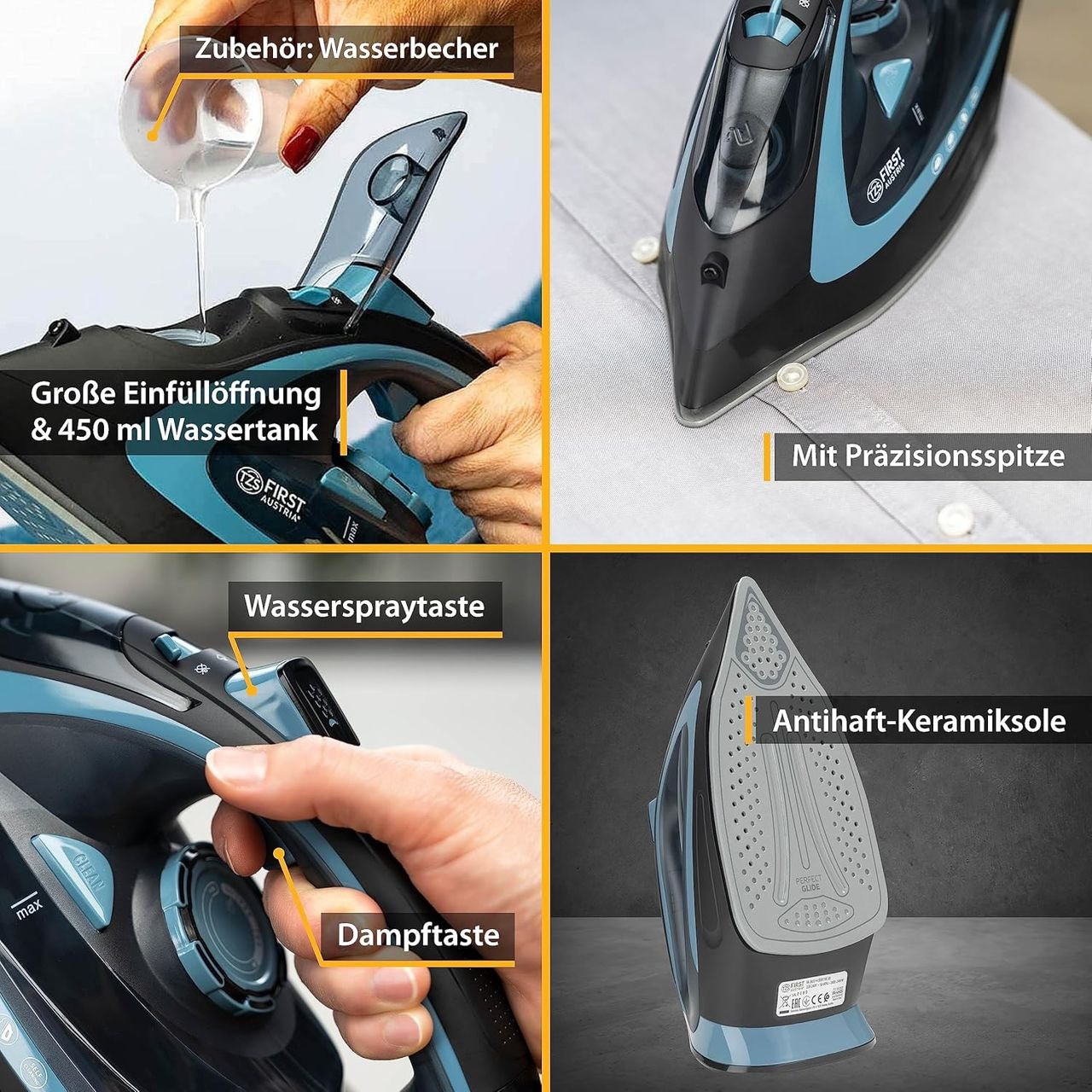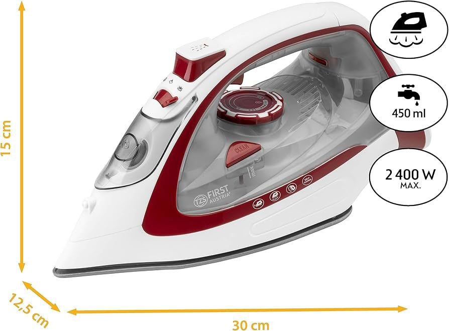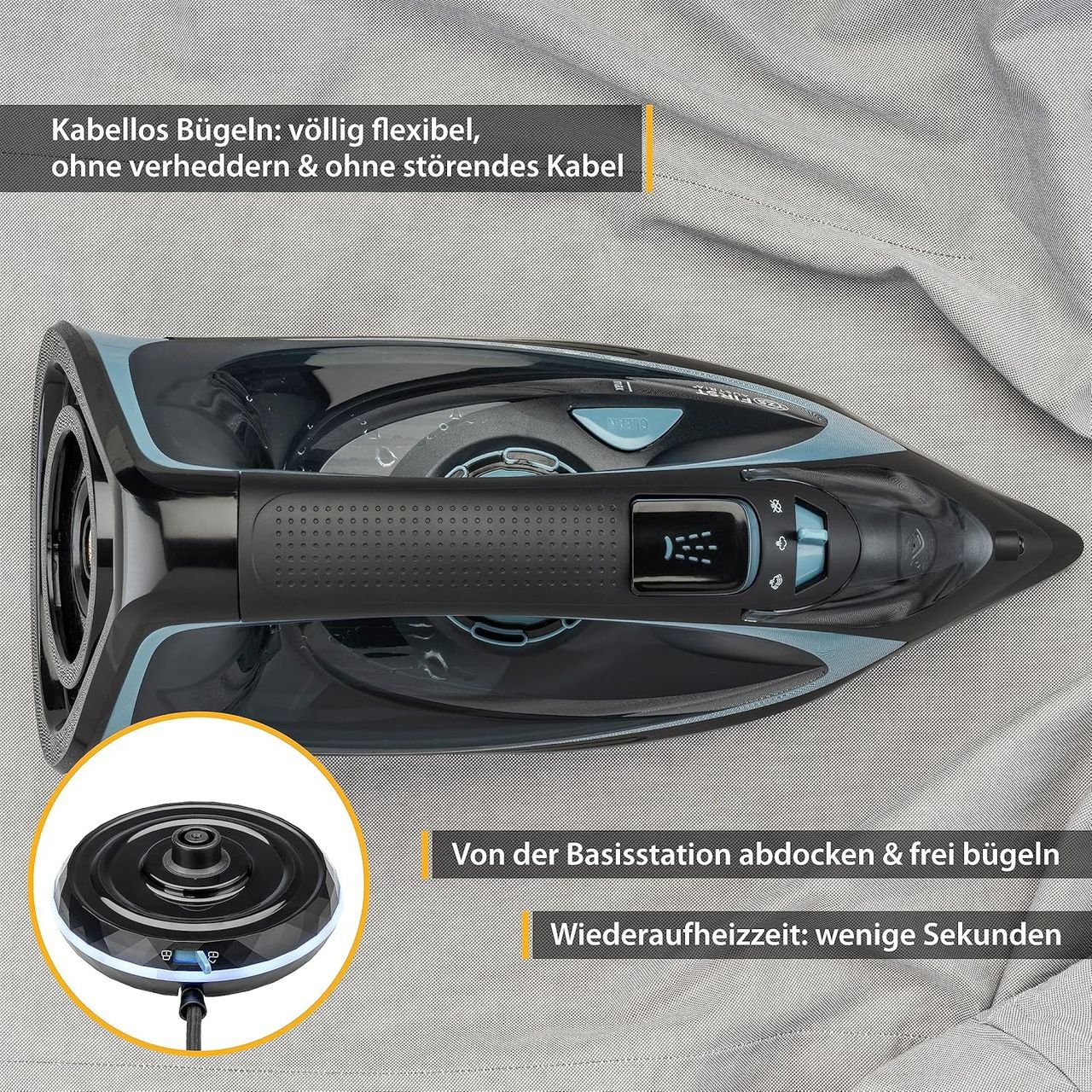 TZS First Austria – Dampfbügeleisen kabellos mit Station 2400W – Schnurloses Dampf Bügeleisen 450 ml Tank mit Tropfstop, verstellbarer Temperatur, Dampfstärke & Keramik Bügelsohle – Mit Vertikaldampf