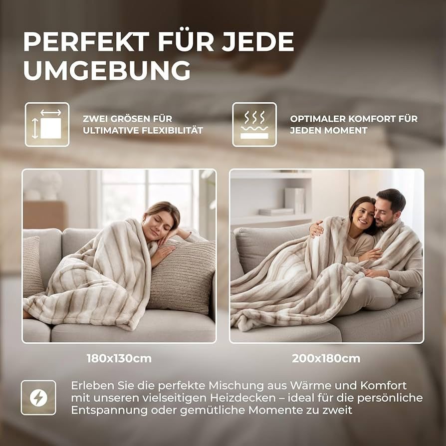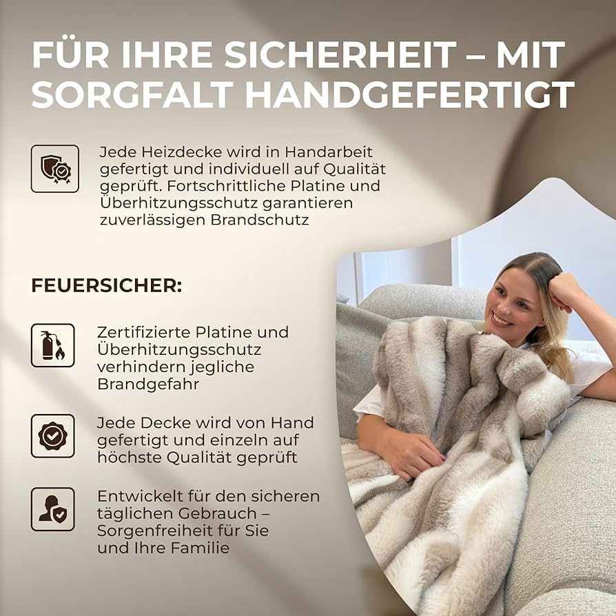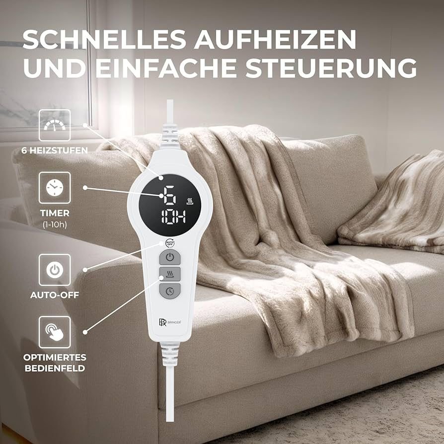 BR Bringer Infrarot Heizdecke – elektrische Kuscheldecke mit Abschaltautomatik & Überhitzungsschutz – 6 Heizstufen, Timer bis 10h, Kabel 2,45m, maschinenwaschbar, OEKO-TEX (200x180cm, Affogato)
