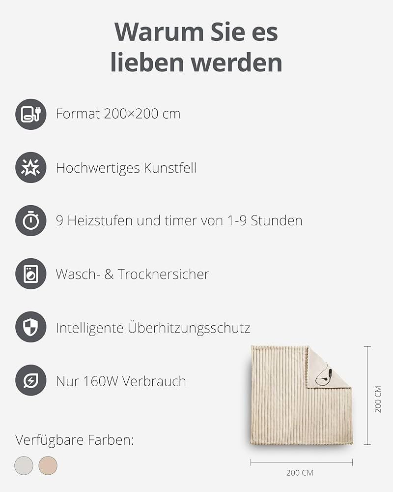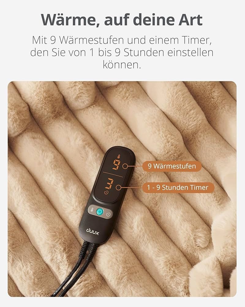PERSÖNLICHE HEIZEINSTELLUNGEN – Wählen Sie aus 9 Heizstufen und stellen Sie den Timer von 1 bis 9 Stunden ein. So kreieren Sie immer Ihre ideale Temperatur, von subtiler Wärme bis hin zu einem kuscheligen Kokon.