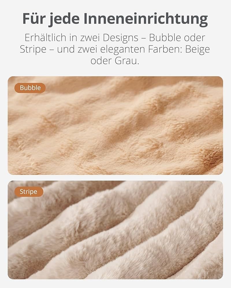 UNWIDERSTEHLICH WEICH – Hergestellt aus luxuriösem Kunstfell mit Bubble oder Streifen-Motiv, erhältlich in Beige oder Grau. Seidig weich, atmungsaktiv und wunderbar bequem auf der Haut.