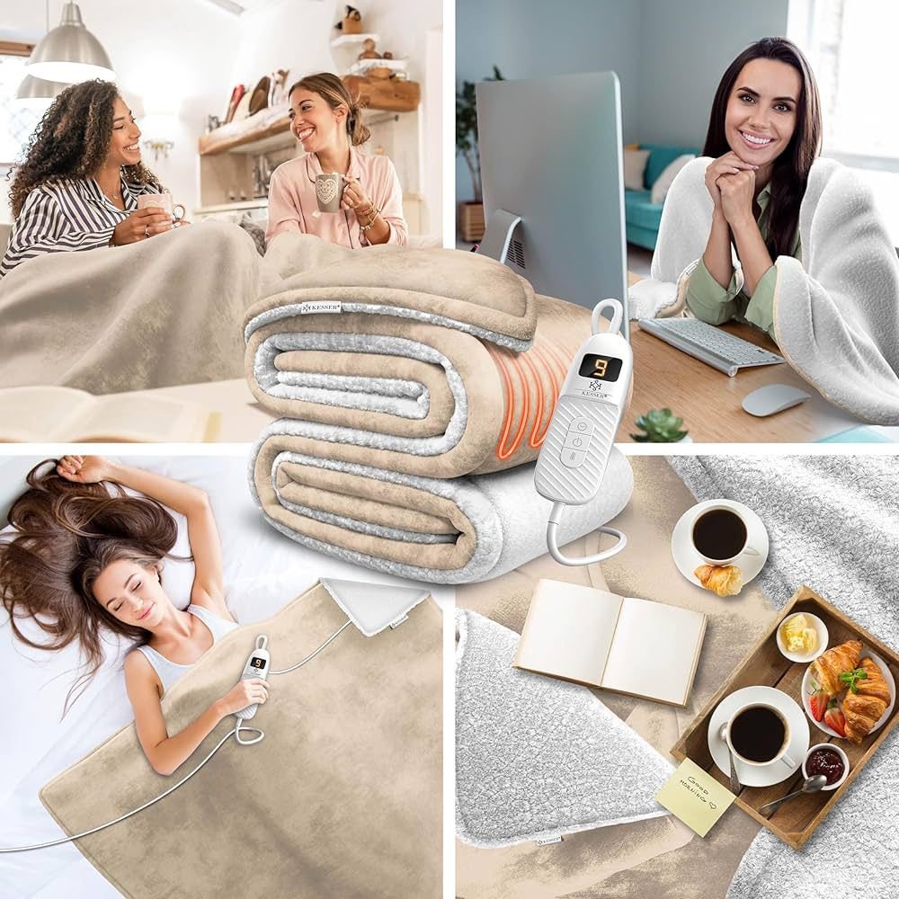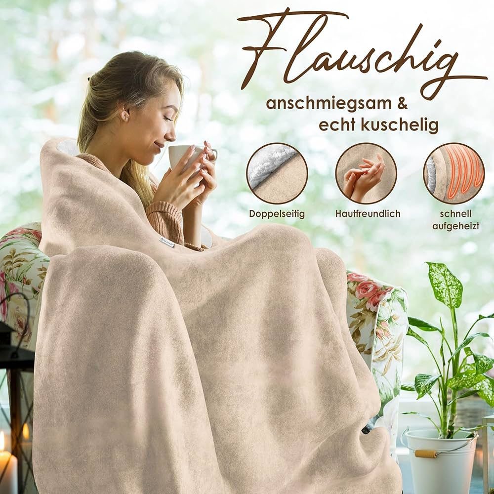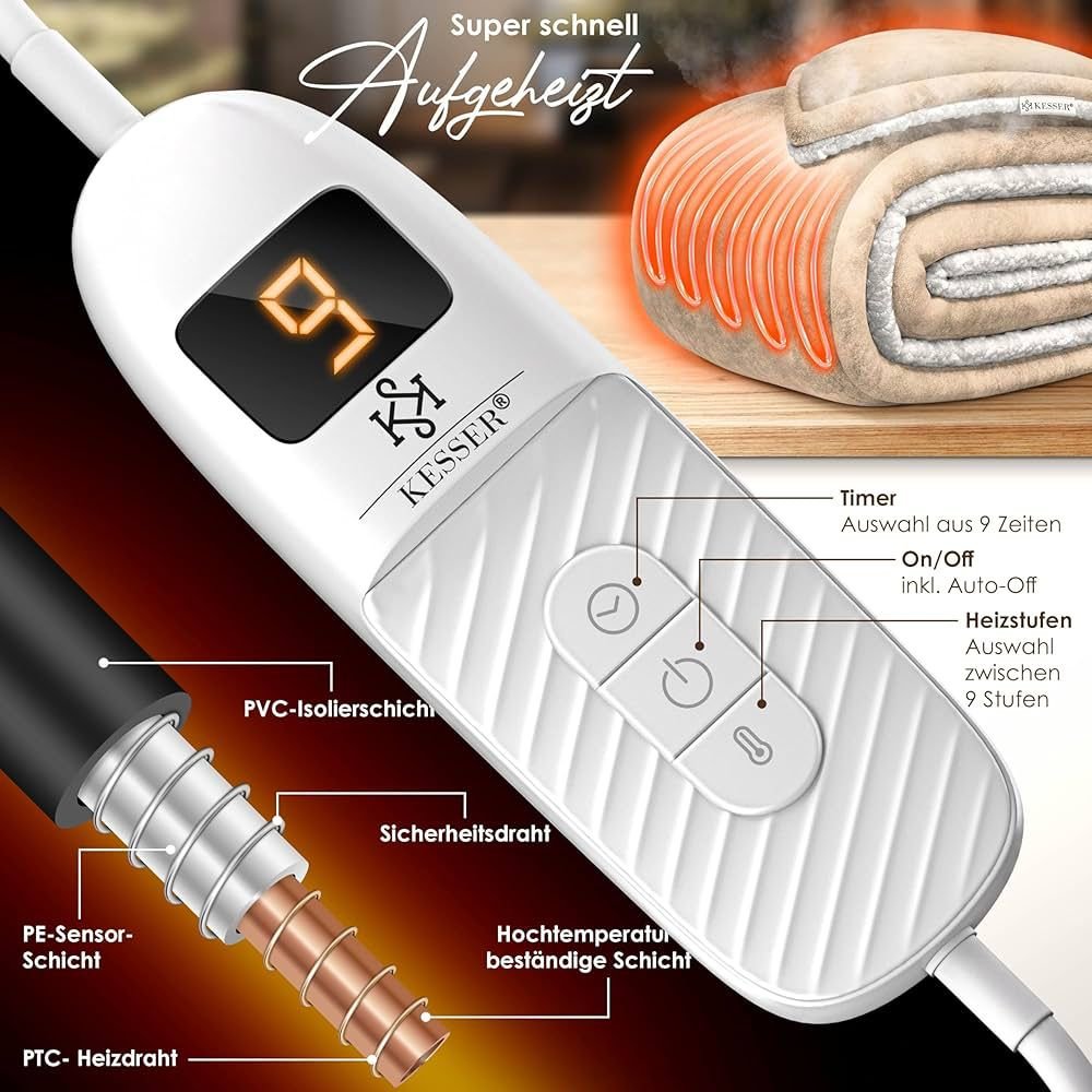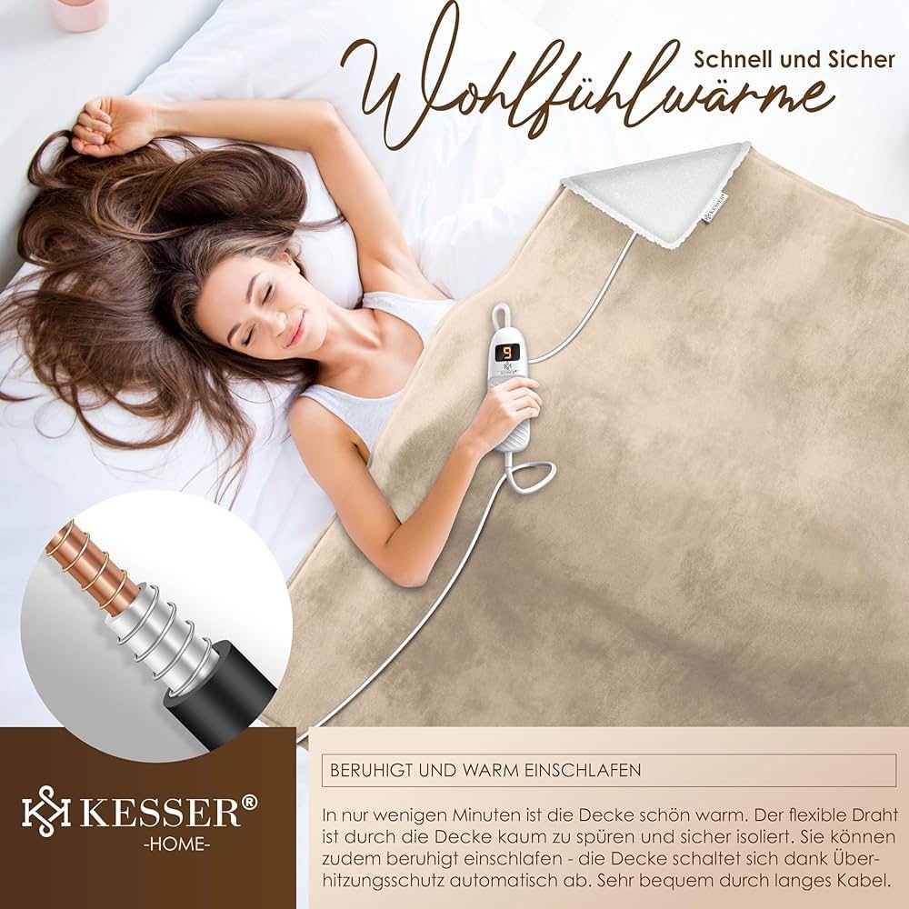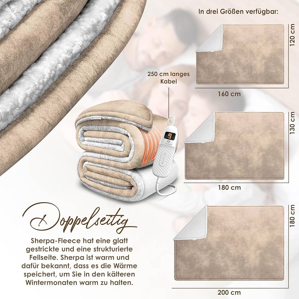 🛋️ 𝐏𝐑𝐄𝐌𝐈𝐔𝐌-𝐅𝐋𝐄𝐄𝐂𝐄-𝐊𝐎𝐌𝐁𝐈𝐍𝐀𝐓𝐈𝐎𝐍 𝐅Ü𝐑 𝐆𝐋𝐄𝐈𝐂𝐇𝐌Äß𝐈𝐆𝐄 𝐖Ä𝐑𝐌𝐄: Die KESSER Heizdecke besteht aus einer beidseitigen Materialkombination aus Sherpa-Fleece und Polar-Fleece. Diese Struktur unterstützt eine gleichmäßige Wärmeverteilung über die gesamte Fläche und verhindert punktuelle Überhitzung. Gleichzeitig sorgt die hohe Faserdichte für eine effiziente Wärmespeicherung bei angenehmer Oberflächentemperatur. Erhältlich in mehreren Größen und Farben, lässt sich die Decke optimal an Körpergröße, Nutzungssituation und Wohnstil anpassen.